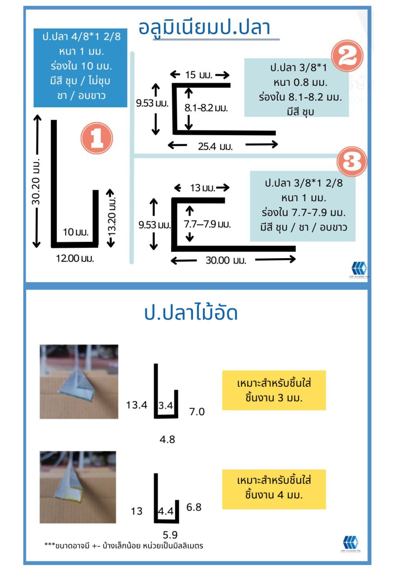 อลูมิเนียมป.ปลา มีลักษณะคล้ายตัวยู แต่มีด้านนึงยาวสูงขึ้นมาเหมือนตัวอักษร ป จึงเรียกว่า อลูมิเนียมป.ปลา มักใช้ในการปิดขอบชิ้นงาน เพื่อให้เกิดความเรียบร้อย